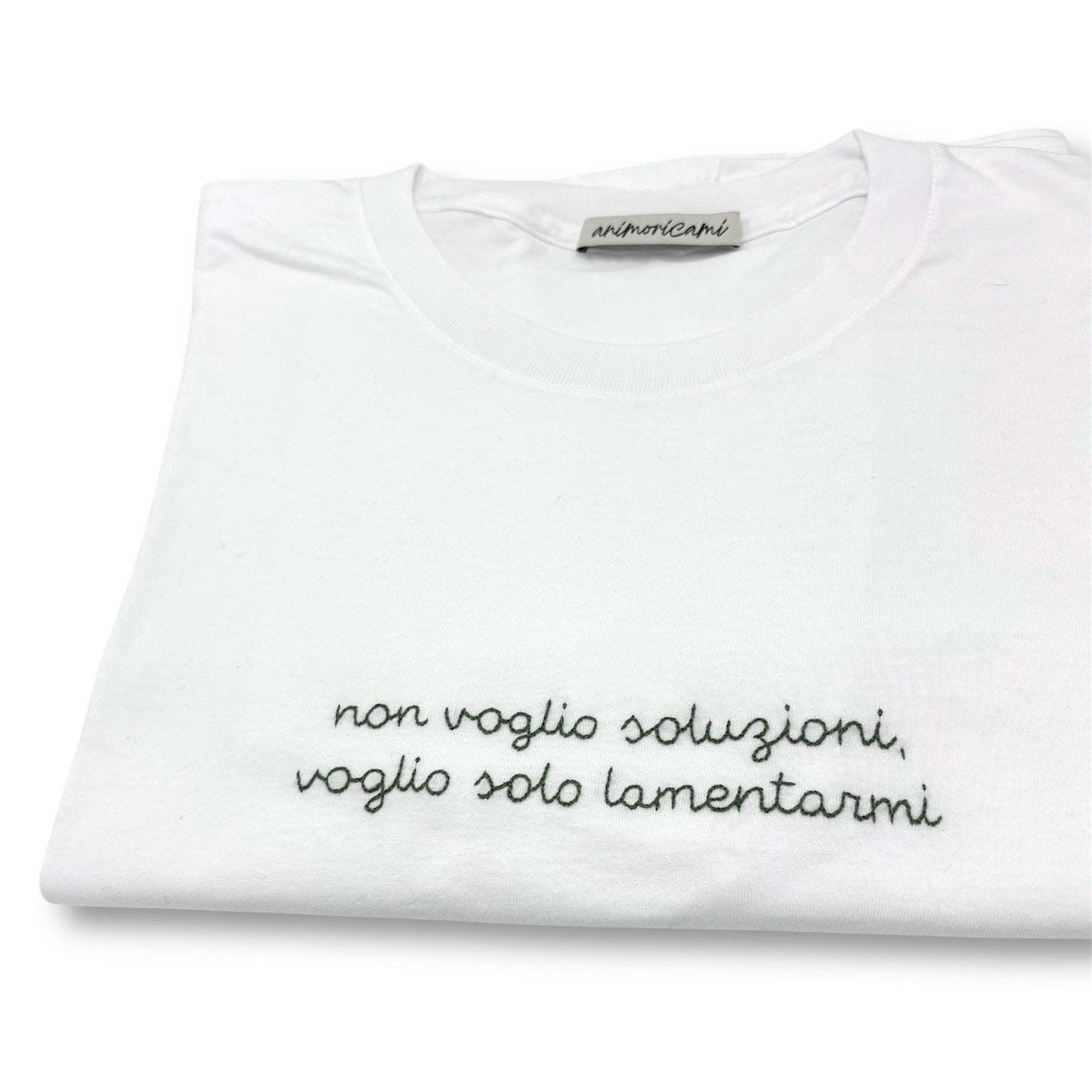 Questa maglietta unisex in 100% cotone (195 gr) è dedicata a chi ha fatto pace con il fatto che lamentarsi, a volte, è terapeutico. Il ricamo, realizzato a mano al centro del petto, dice tutto: Non voglio soluzioni, voglio solo lamentarmi.